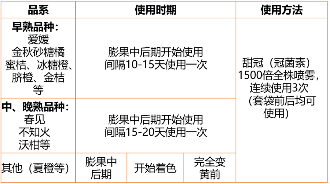 甜冠(冠菌素)適用于各類柑橘品種,如愛媛、金秋砂糖橘、砂糖橘、冰糖橙、金桔、沃柑、耙耙柑、不知火等。促進果實轉色、顏色紅潤,表皮靚麗,提升干物質積累,如提升糖度、芳香味物質積累,提高果實品質,提前上市,提升抗逆性,延長果實留樹保鮮和果實貨架期,減少流通環(huán)節(jié)損耗。